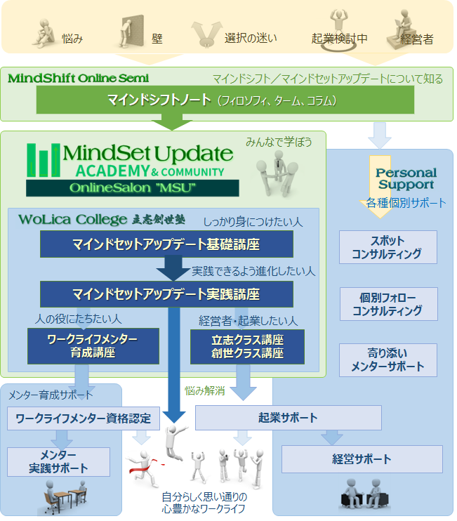 さらに、起業したい人、今の事業を改革したい人、心豊かに生きたい人など、しっかり学んで身につけたい人は、WoLicaカレッジで学んでください。個別のサポートや、メンター育成プログラムもご用意しています。