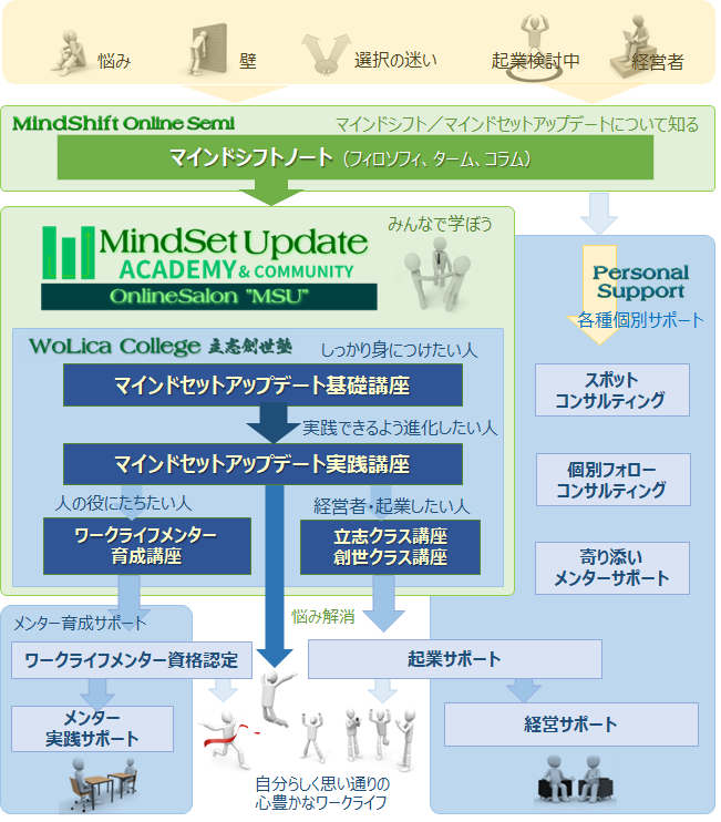 そして、しっかりマインドセットをアップデートし 定着させるための講座や、それらを実践したり、起業や事業拡大をサポートする個人サポートをご提供しています。(有料)